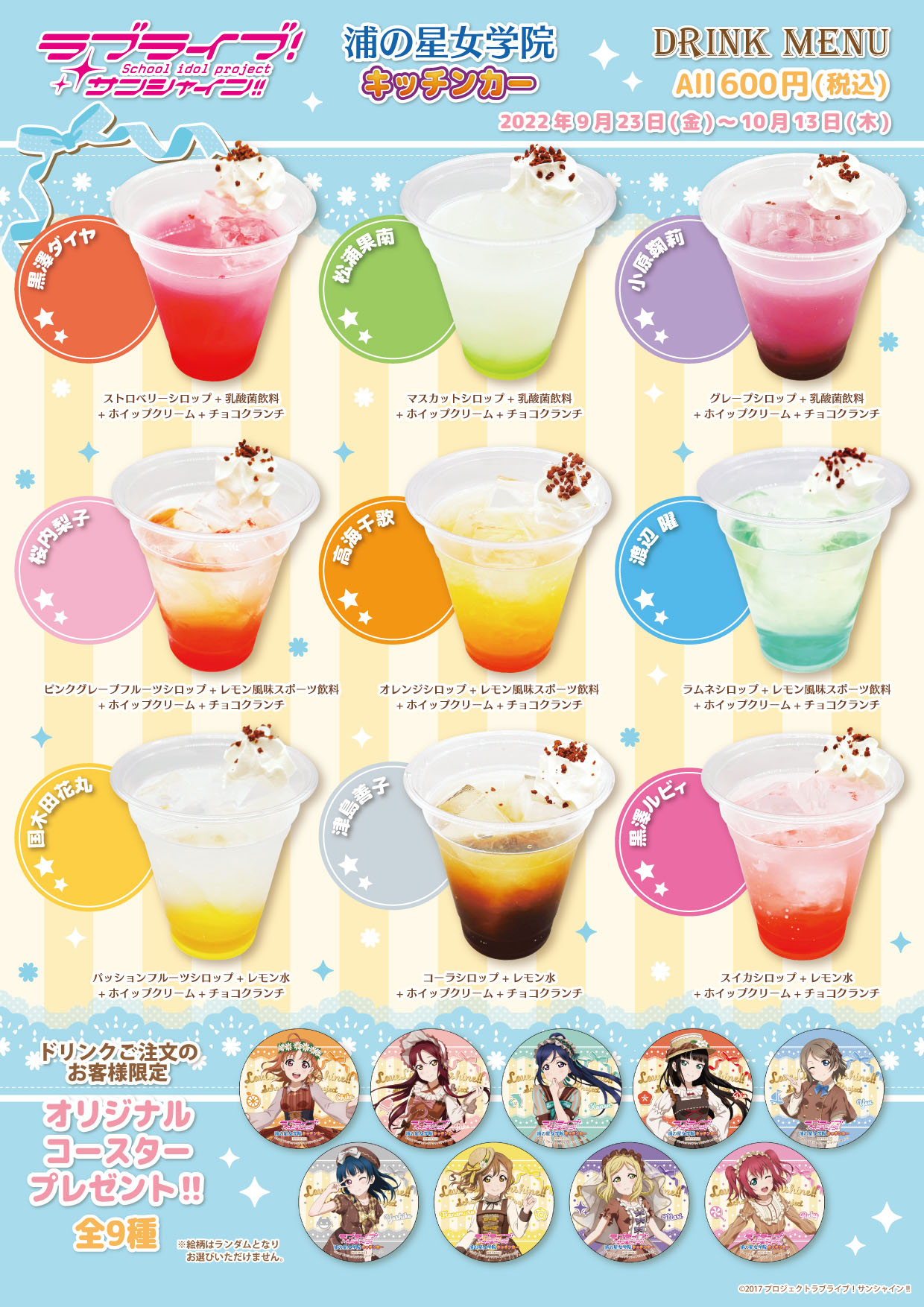 沼津エリアにて営業中の『浦の星女学院キッチンカー』ですが、この度ドリンクメニューが一新となり、特典のコースターも変更になります!
