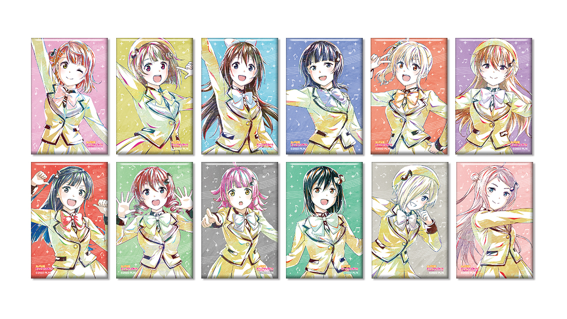 上原 歩夢、中須 かすみ、桜坂 しずく、朝香 果林、宮下 愛、近江 彼方、優木 せつ菜、エマ・ヴェルデ、天王寺 璃奈、三船 栞子、ミア・テイラー、鐘 嵐珠を新たなタッチで魅力的に表現し、スクエア缶バッジに仕上げました。