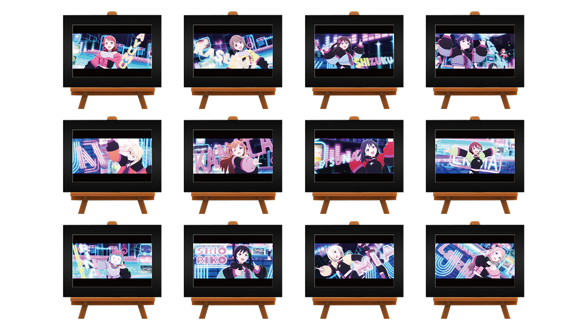上原 歩夢、中須 かすみ、桜坂 しずく、朝香 果林、宮下 愛、近江 彼方、優木 せつ菜、エマ・ヴェルデ、天王寺 璃奈、三船 栞子、ミア・テイラー、鐘 嵐珠の印象的なシーンをミニアートフレームに仕上げました。