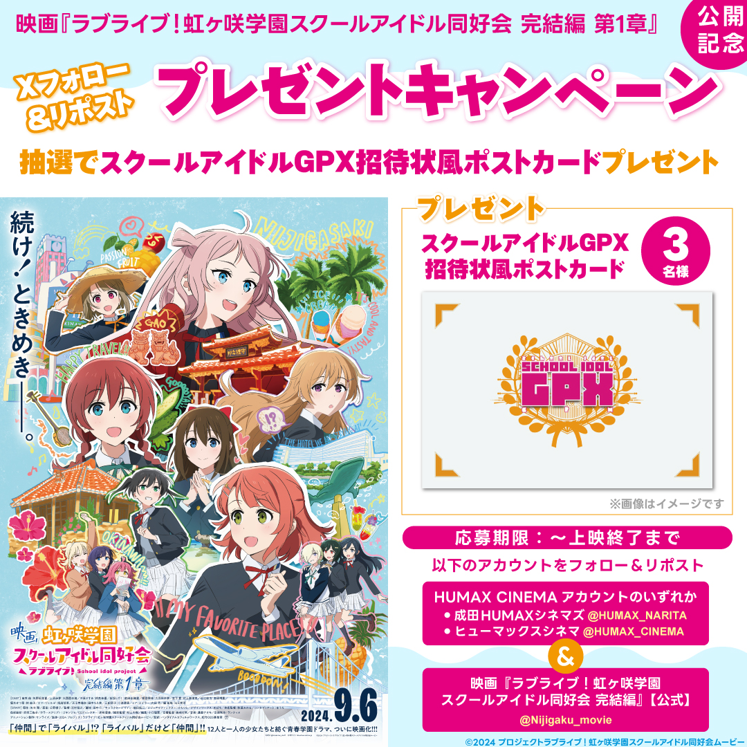 本作の公開を記念して、成田HUMAXシネマズでのXフォロー&リポストで、スクールアイドルGPX招待状風ポストカードが抽選で当たるプレゼントキャンペーンと、フォトスポットの設置が決定いたしました。