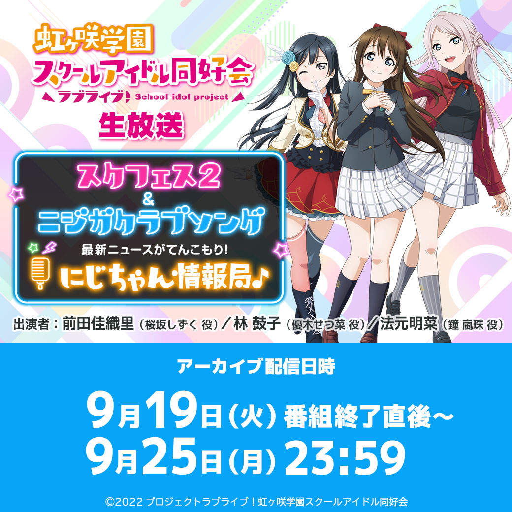 『ラブライブ!虹ヶ咲学園スクールアイドル同好会生放送 スクフェス2&ニジガクラブソング 最新ニュースがてんこもり!にじちゃん情報局♪』アーカイブ配信決定!