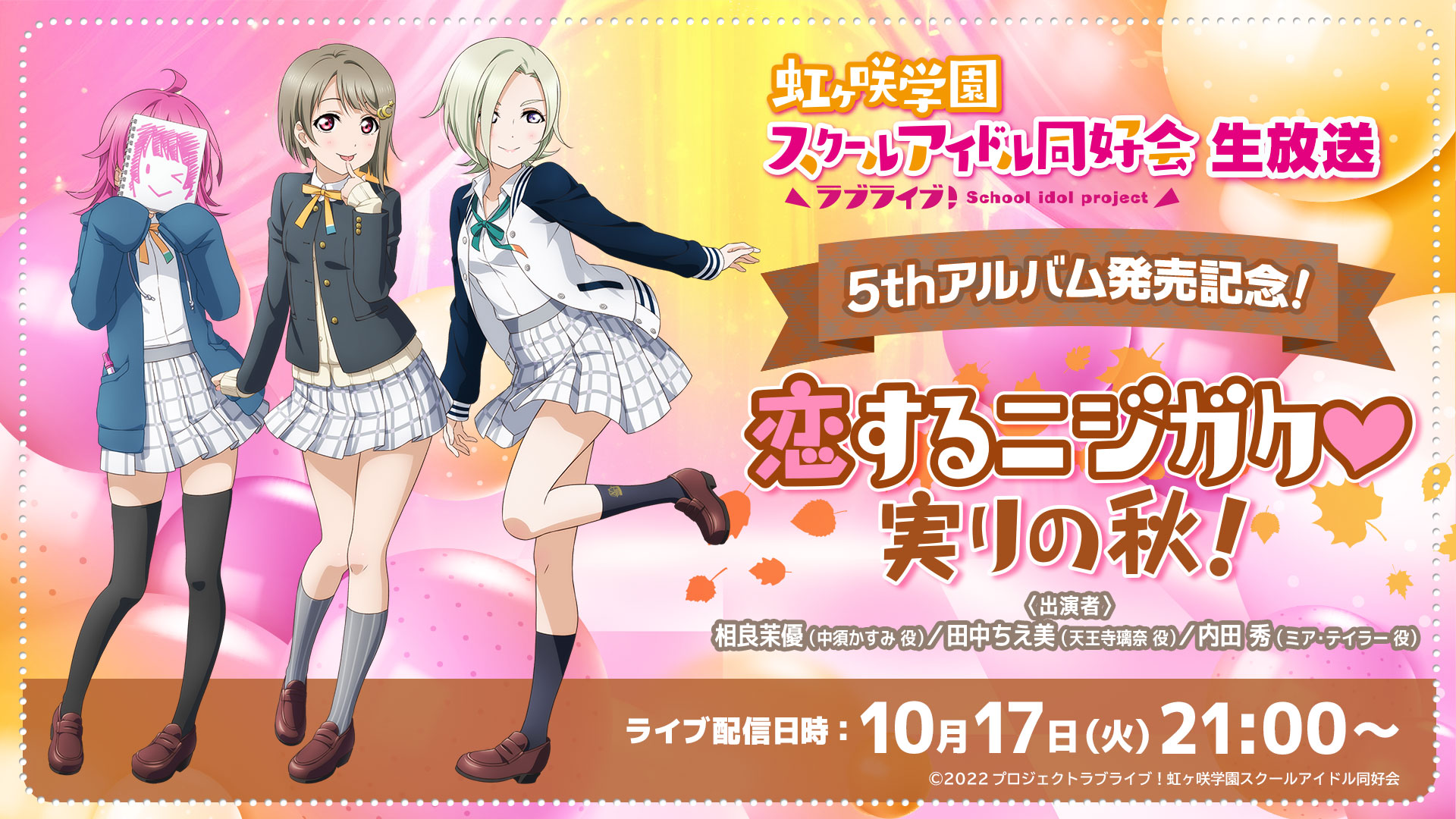 「ラブライブ!虹ヶ咲学園スクールアイドル同好会生放送 5thアルバム発売記念!恋するニジガク♡実りの秋!」のお知らせ!